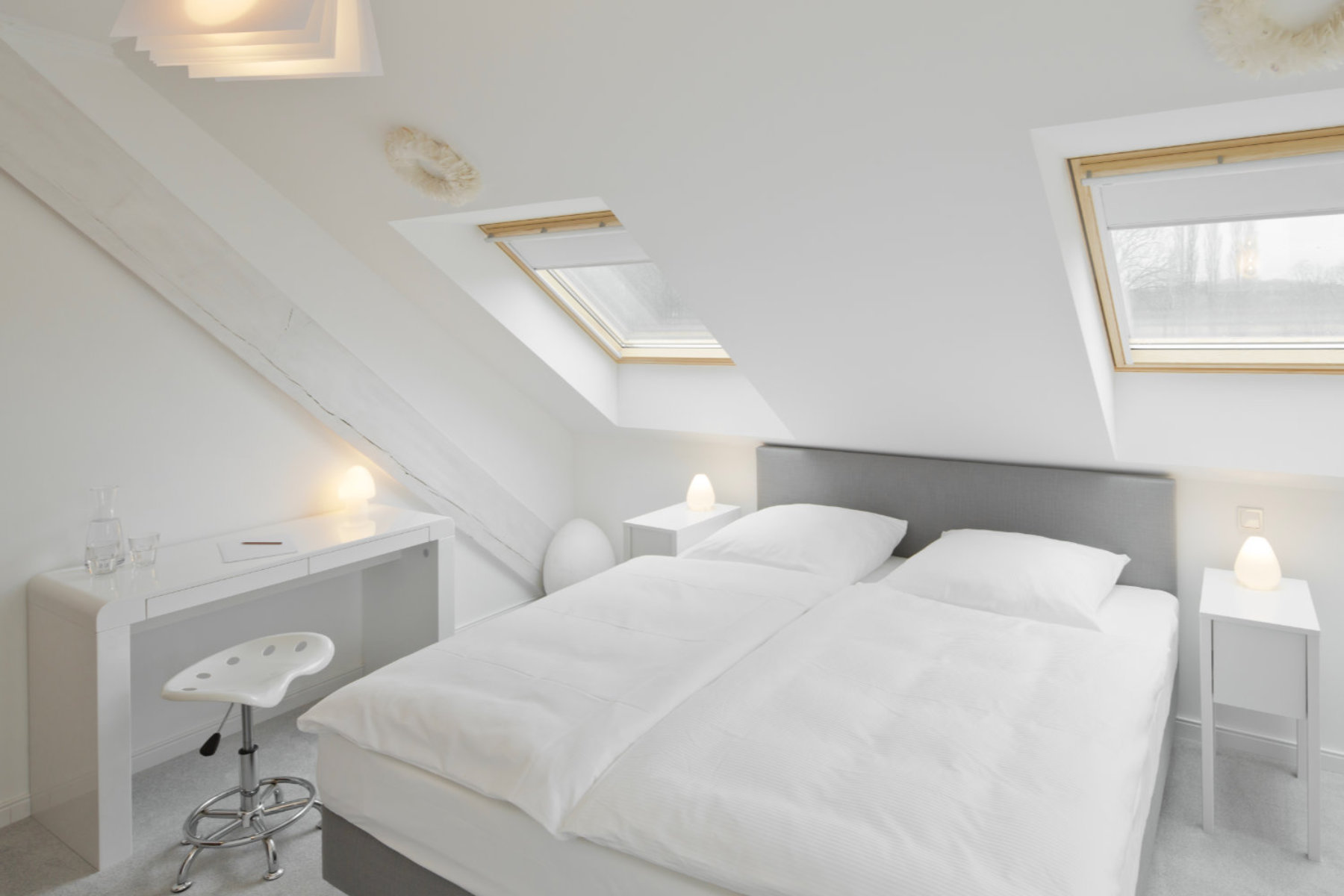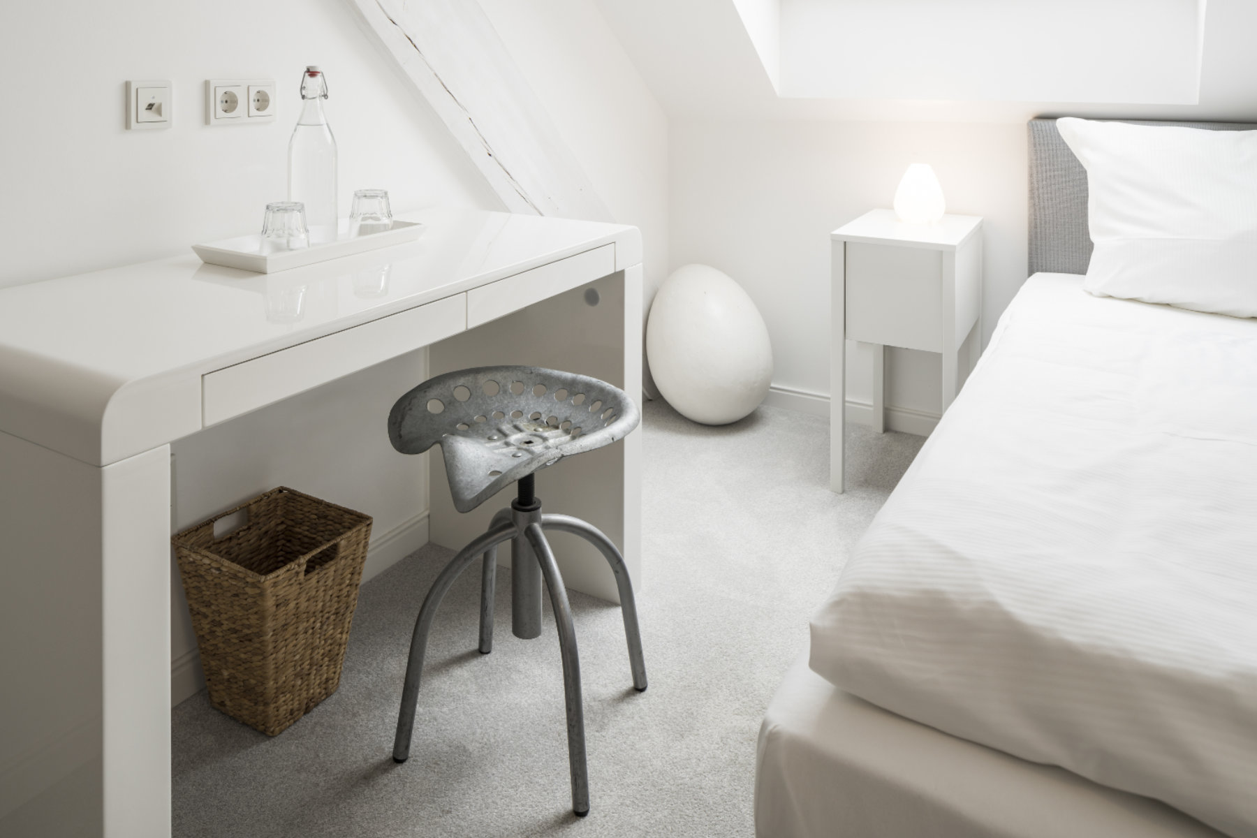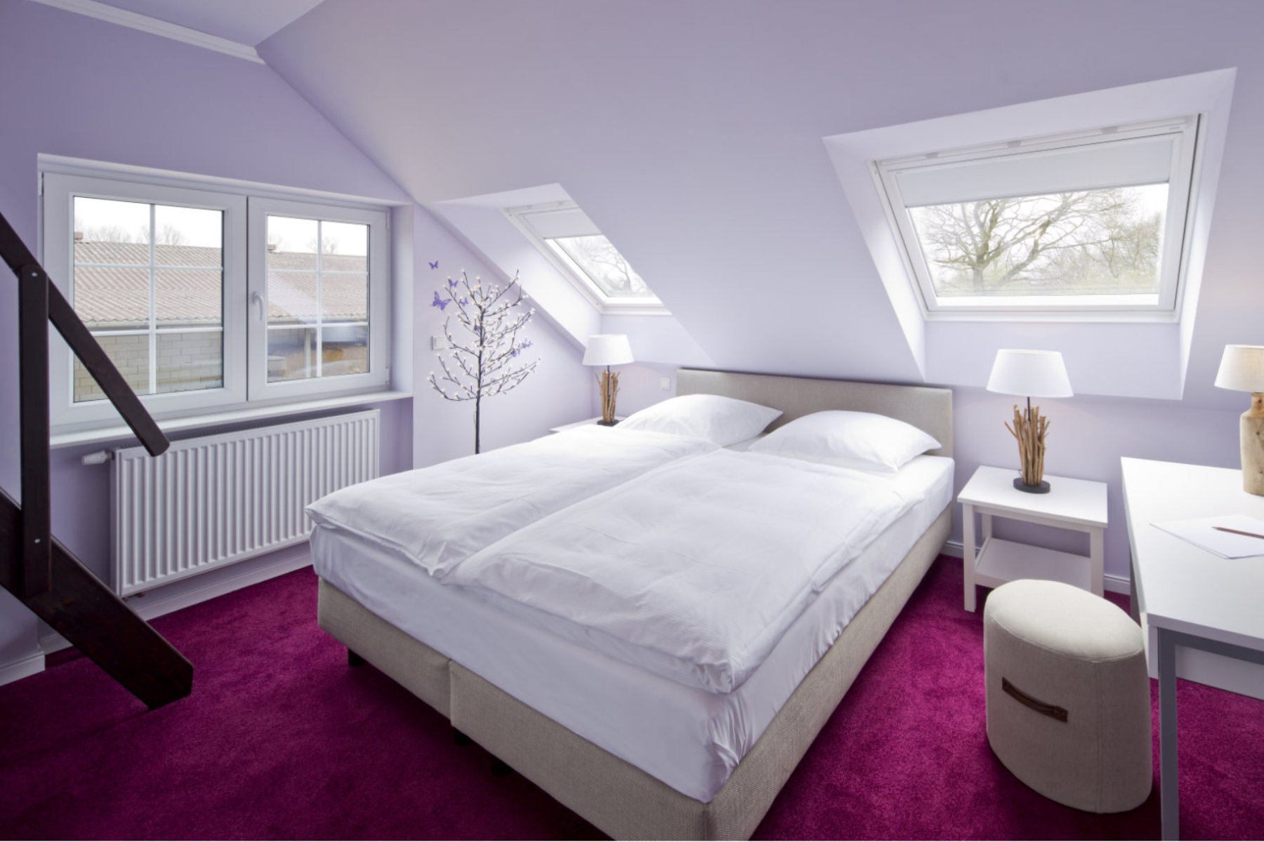 Eigentlich müsste dieses Zimmer „Federvieh“ heißen. Bloß welches? Braune Ente, schwarzer Rabe oder grauer Star? Es wurde schließlich schneehuhnweiß und dadurch fast puristisch. Das Eckzimmer ist lichtdurchflutet und ist unser einziges unbuntes Zimmer.
