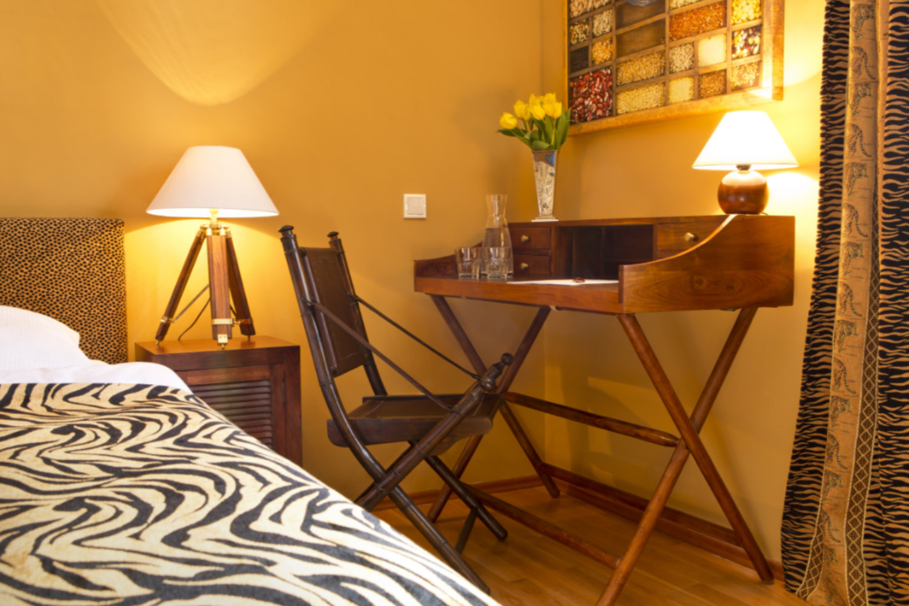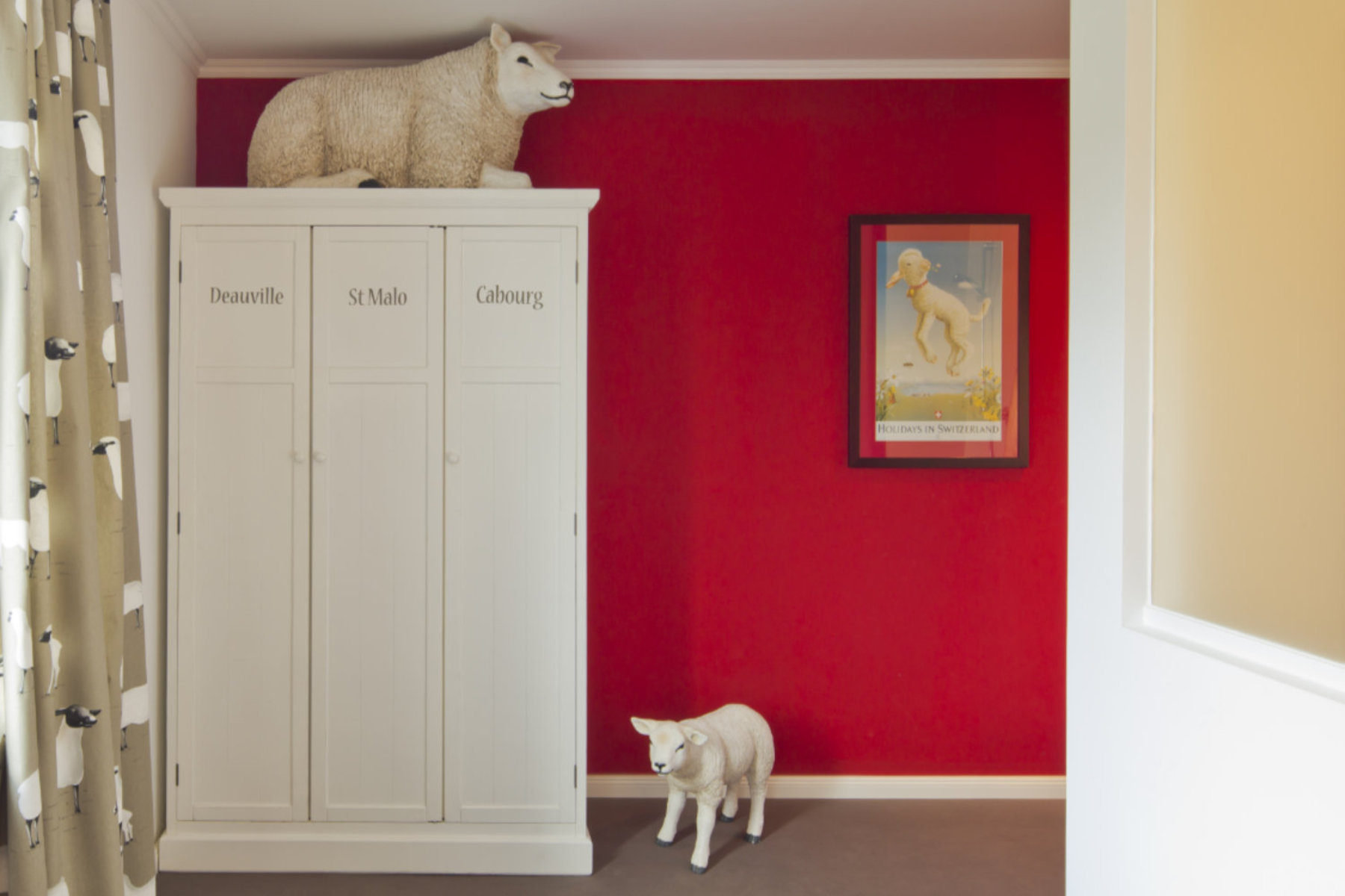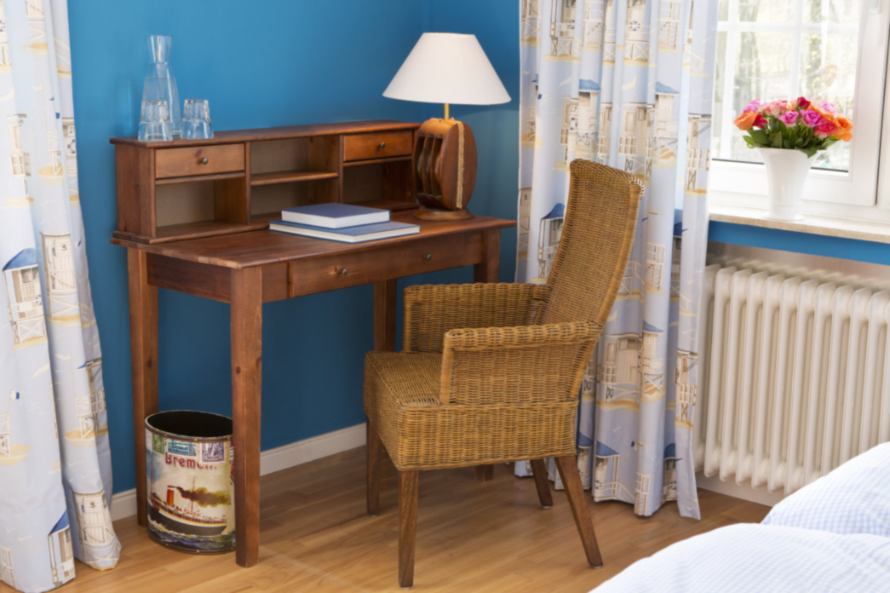 Eigentlich müsste dieses Zimmer „Federvieh“ heißen. Bloß welches? Braune Ente, schwarzer Rabe oder grauer Star? Es wurde schließlich schneehuhnweiß und dadurch fast puristisch. Das Eckzimmer ist lichtdurchflutet und ist unser einziges unbuntes Zimmer.