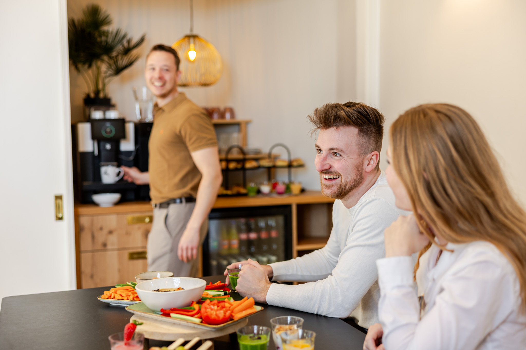 - heller, lichtdurchfluteter Saal mit Hochtischen, Kaffeevollautomat und Getränkekühlschrank